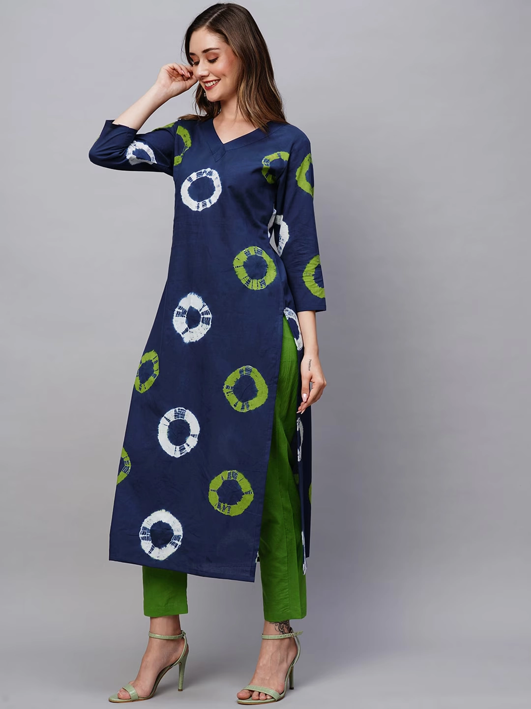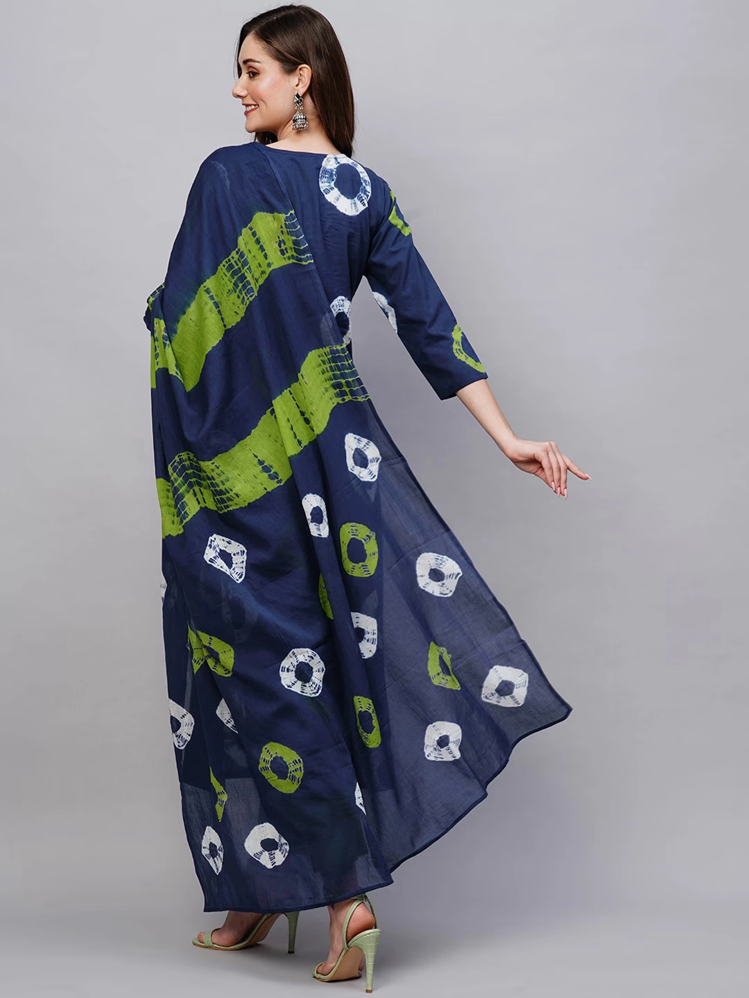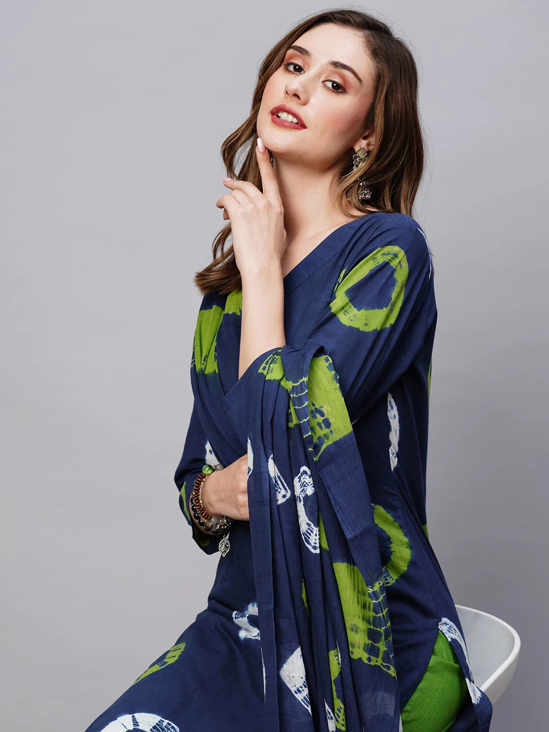 Navy blue, green and white dyed Kurta with Trousers & dupatta.